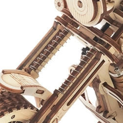 See puidust mehaaniline mootorratas on suurepärane valik kõigile, kes armastavad disaini, tehnikat ja korralikku käsitööd. Üleskeeratav vedrumehhanism koos päästikuga paneb mudeli hoogsalt liikuma, samas kui toimiv lenks võimaldab osalist suunajuhtimist. Realistlikku mootori tööd täiendab kaunilt kolbide liikumine ja esihargi toimiv vedrustus.