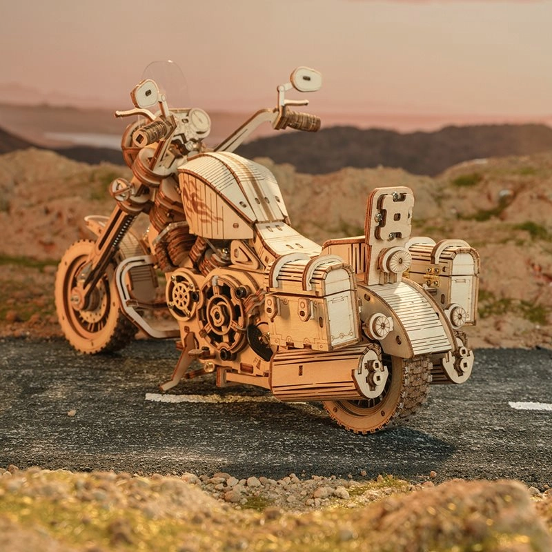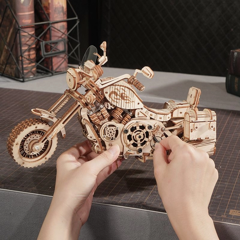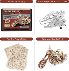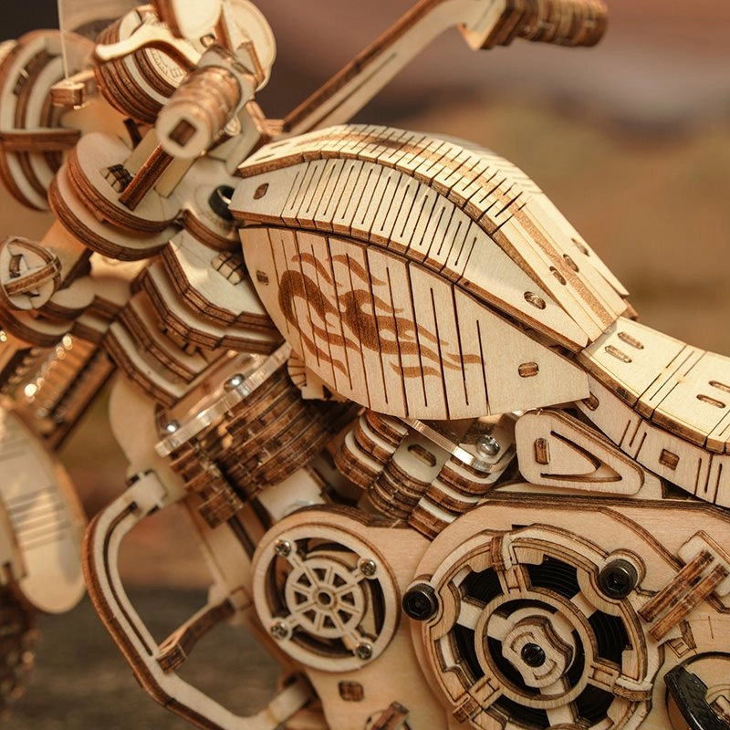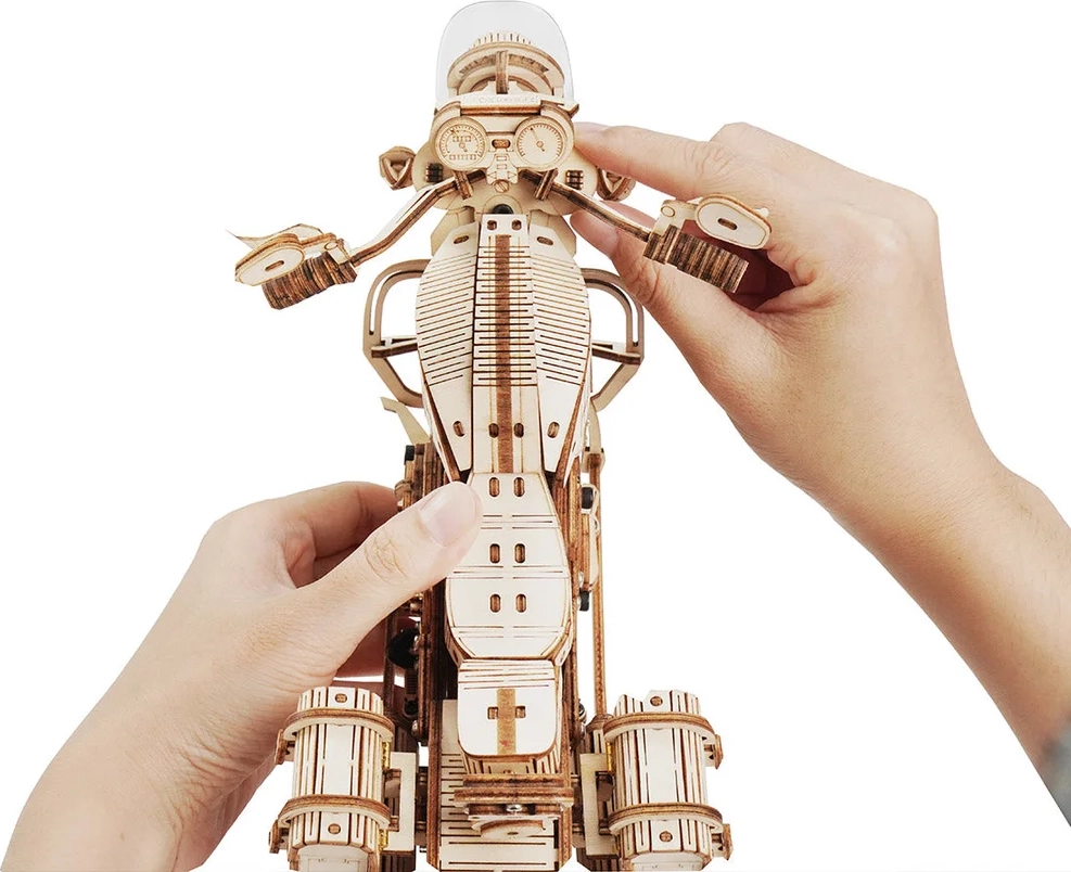 Avasta mudeliehituse rõõm selle täpse 3D vineerist mootorratta komplektiga. Mudel pakub vedruga üleskeeratavat jõuallikat, toimivat juhtimist, liikuvaid kolbe ja töötavat esiamortisaatorit. Tänu 420 detailile ja keskmisele raskusastmele naudid 4–5 tundi tegevust; pärast kokkupanekut on ratas võimeline iseseisvaks sõiduks ning paistab silma ka dekoratiivse välimuse ja väikeste panipaikadega sadula juures.
