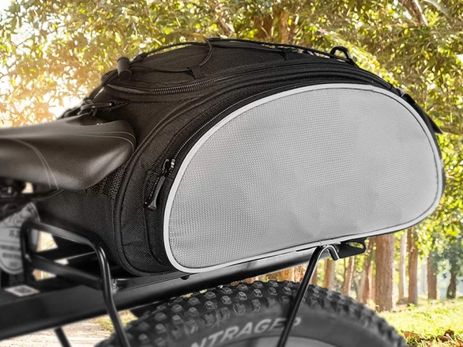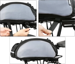 Naudi rattaretki selle praktilise rattakotiga, mis kinnitub kergesti pakiraamile. See pakub põhisahtlit sisetaskuga ja kahte lukuga külgtaskut veelgi suurema mahutavuse jaoks.