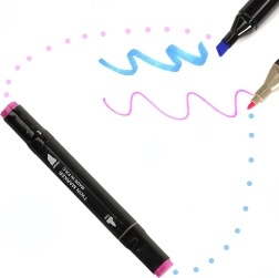 Igal markeril on kaks otsikut – lai kiireks suuremate pindade täitmiseks ja peen täpseks jooneks ning detailideks. Praktiline alus hoiab värvid käepärast ja korrapäraselt, samas kui tõmblukuga vutlar teeb kogu komplekti kaasas kandmise mugavaks.