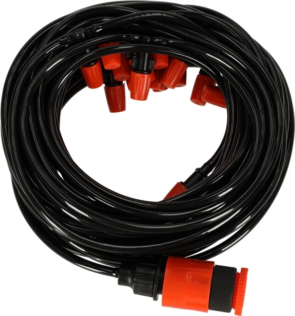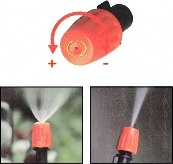 Tänu plastikust düüsisüsteemile saad hõlpsalt reguleerida udu intensiivsust ja tilgodiameetrit, mis võimaldab sul täielikult kontrollida oma aia mikroklimat.