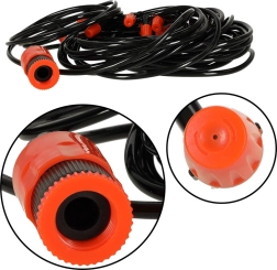 Vooliku saate hõlpsasti ühendada tavalise aiavooliku või otse kraaniga. Vooluhulga reguleerimine pihustitel võimaldab kohandada udu intensiivsust erinevatele kohtadele. Tänu võimalusele voolikut lühendada saate pihustite vahekauguse täpselt oma vajaduste järgi määrata ja suunata vee sinna, kus seda kõige rohkem vaja läheb.