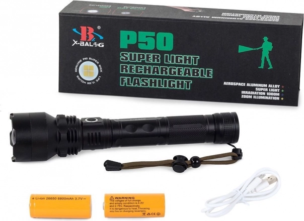 Tugev lennundusalumiiniumist korpus kõva anodeeritud pinnaga on põrutuskindel ja kaitstud vastavalt IPX5 standardile. Libisemiskindel pind, ergonomiline käepide ja randmepael suurendavad kindlat haaret. Kaks 26650 akut tagavad pika tööaja, USB-laadimine on mugav välitingimustes ning LED-indikaator teavitab laetuse olekust. Saadaval on 3 režiimi – 100 %, 50 % ja strobo.