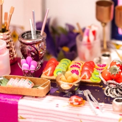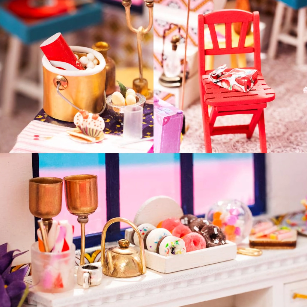Miniatuur sisaldab detailseid elemente, nagu värvilised toolid, lauad ja muud dekoratsioonid, mis matkivad tõetruult päris interjööri.