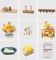 Naudige köögi detailset viimistlust koos kõigi vajalike elementidega realistliku miniatuuri jaoks.