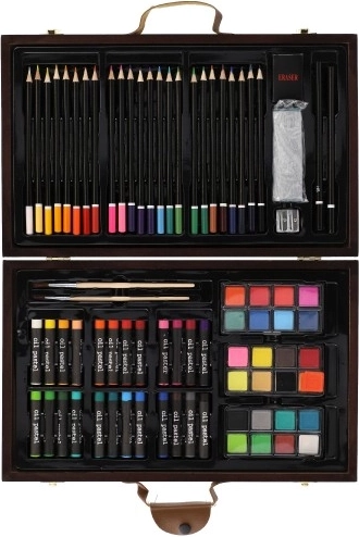 Värvide ja tarvikutega täidetud puidust kohver on täiuslik kaaslane noortele loojatele. See sisaldab kõike, mida on vaja maalimiseks ja joonistamiseks, elegantses ja kergesti kaasaskantavas pakendis: