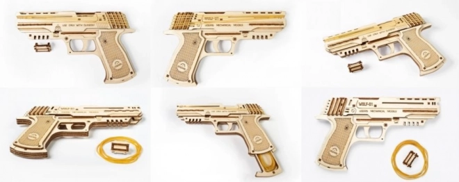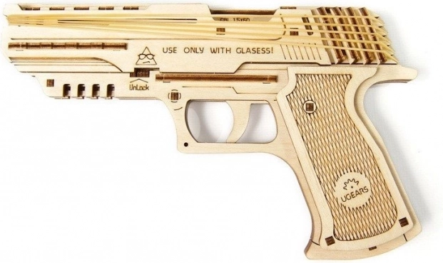 UGEARS Wolf-01 on detailne puidust püstoli replika kummipaelajamiga, mille paned kokku ilma liimita vaid täpselt väljalõigatud detailide abil. Valmismudel on toimiv mehaaniline seade, mis laseb usaldusväärselt kummipaelu ning näitab praktikas, kuidas töötavad koos hammasrattad, päästikumehhanism ja materjalide elastsus.