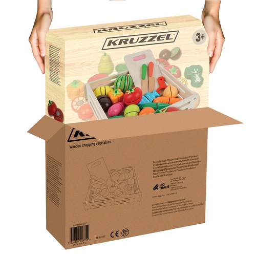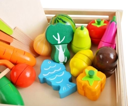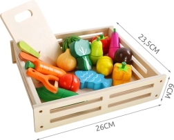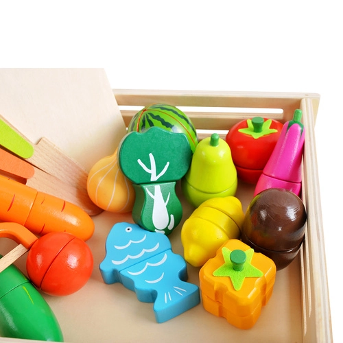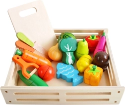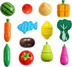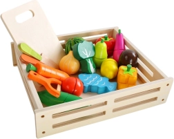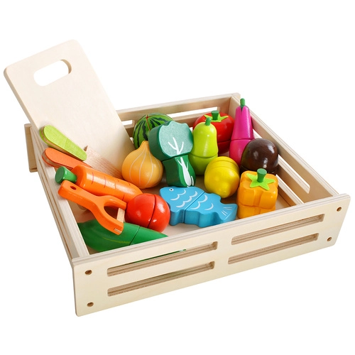 Avasta puidust komplekt, mis muudab iga lapse kokkamise lõbusaks ja harivaks seikluseks. Realistlikult kujundatud puuviljad, köögiviljad ja kala on jagatud osadeks ja ühendatud takjapaeltega, nii et lapsed saavad neid turvaliselt lõigata ja uuesti kokku panna. Erksad värvid köidavad tähelepanu ning innustavad maitseid ja vorme avastama.