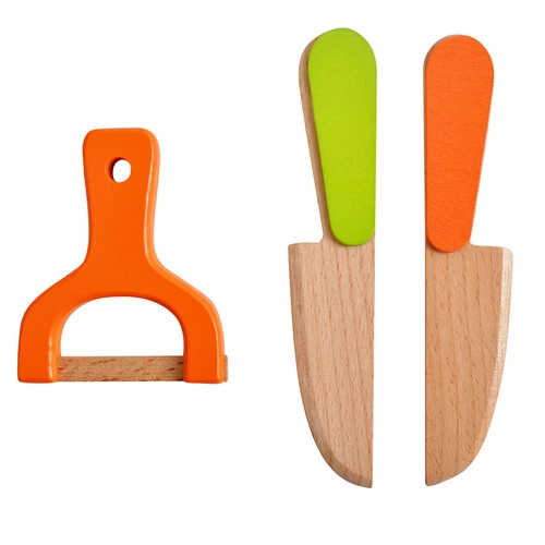 Komplekti kuuluvad hoiukast, 2 puidust noakest, lõikelaud ja koorimisnoa imitatsioon. Komplekt arendab peenmotoorikat, käe-silma koordinatsiooni, loovust ja koostööd ühises mängus. Suurepärane lastemängukööki, lasteaeda ja kaasa teele.