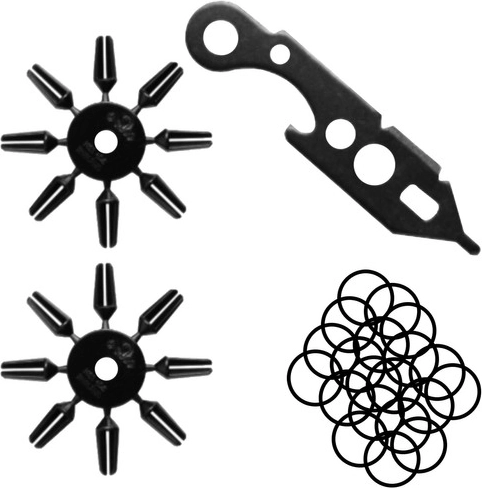 Komplekt sisaldab 12 noolt, 100 varutera, kaitsekorke ja multifunktsionaalset tööriista.