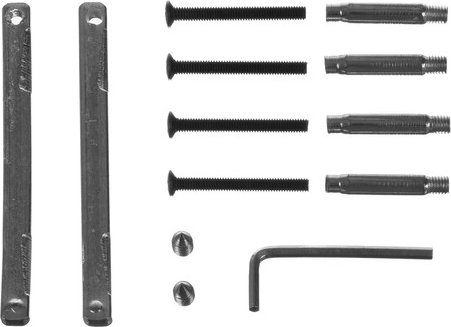 - 2× link, 2× võtmeauguga rosett, läbivad paigalduskruvid, puitkruvid, 2× telg, kuuskantkruvid, kuuskantvõti