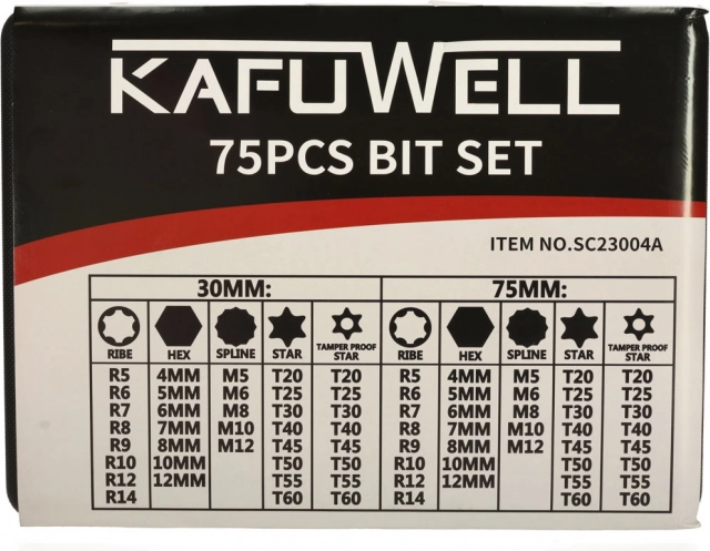 Universaalne KAFUWELLi bitikomplekt 75 detailiga ühendab jõudluse ja täpsuse nii töökotta kui ka koju. Vastupidavad bitid CrV sulamist, lühikesed ja pikad variandid, tüübid HEX, RIBE, SPLINE, TORX ja TORX Security ning lisaks 3 reduktorit 1/2" ja 3/8". Selge paigutusega praktiline transpordikohver hoiab korra majas ja lihtsustab kaasaskandmist.