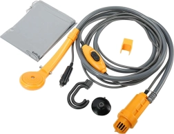 Komplekt sisaldab kõike vajalikku: sukelpumpa, dušiotsikut, voolikut, iminappa ja konksu kinnitamiseks aknale või keredetailile. Kokkupakitult võtab vähe ruumi, mis on suur pluss reisimisel ja laagris.