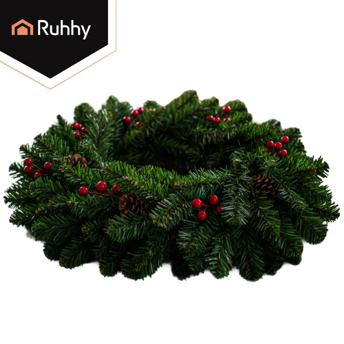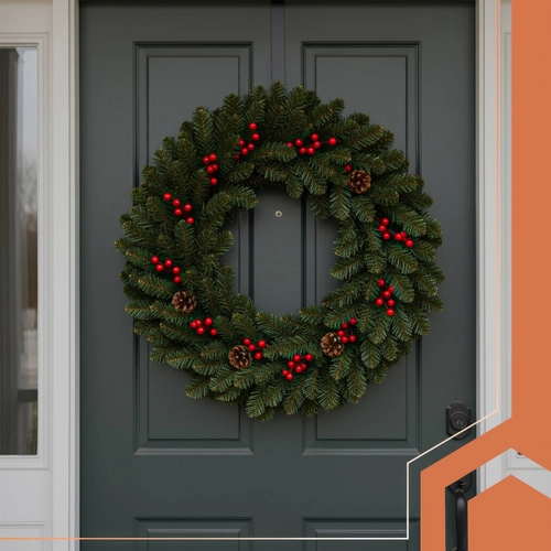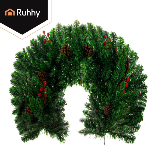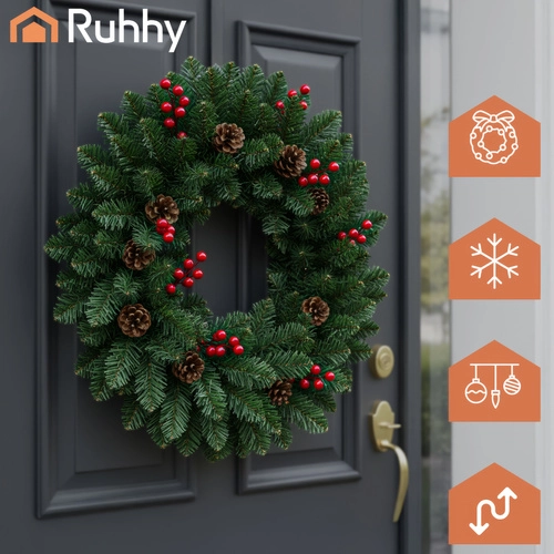 Elegantselt kombineeritud roheline okastik, punased marjad ja looduslikult mõjuvad käbid loovad pilkupüüdva piduliku kaunistuse ustele, seintele ja karniisidele.