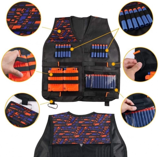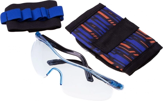 See universaalne NERF-blasterite lisakomplekt ühendab ohutuse, moonakorralduse ja kiiruse. Taktikaline vest reguleeritavate rihmadega hoiab salved ja nooled süsteemselt korras, et moon oleks alati käeulatuses. Kaitseprillid kaitsevad silmi nii õues kui siseruumides mängides.