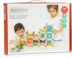 Puidust ehituskomplekt ECOTOYSilt arendab laste kujutlusvõimet ja osavust 128 värvilise klotsi ning tegelaste, autode ja puude motiividega.