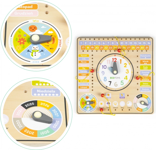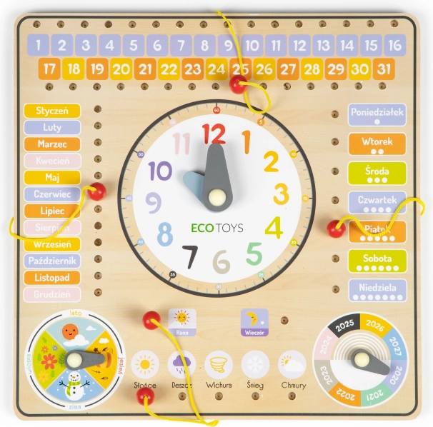 Tahvlil on poolakeelsed nimetused, kuid selle lihtsa arusaadavuse ja vastupidava puidust konstruktsiooni tõttu sobib see suurepäraselt ka eesti lastele. Pööratava näidiku abil aitab see paremini mõista aastaaegade vaheldumist. Tahvlil on võimalik märkida ka aasta vahemikus 2020–2027.