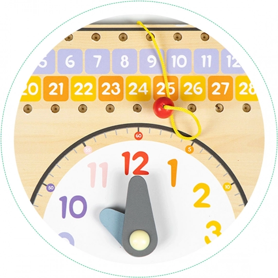 Laske lastel avastada maailma selle värvilise ja ohutu puidust tahvli abil. See aitab lastel ära tunda nädalapäevi, päevade järjestust ja kuude perioode. Spetsiaalsete väljade abil saavad lapsed kalendris päevi märkida nööri ja puidust klambriga.