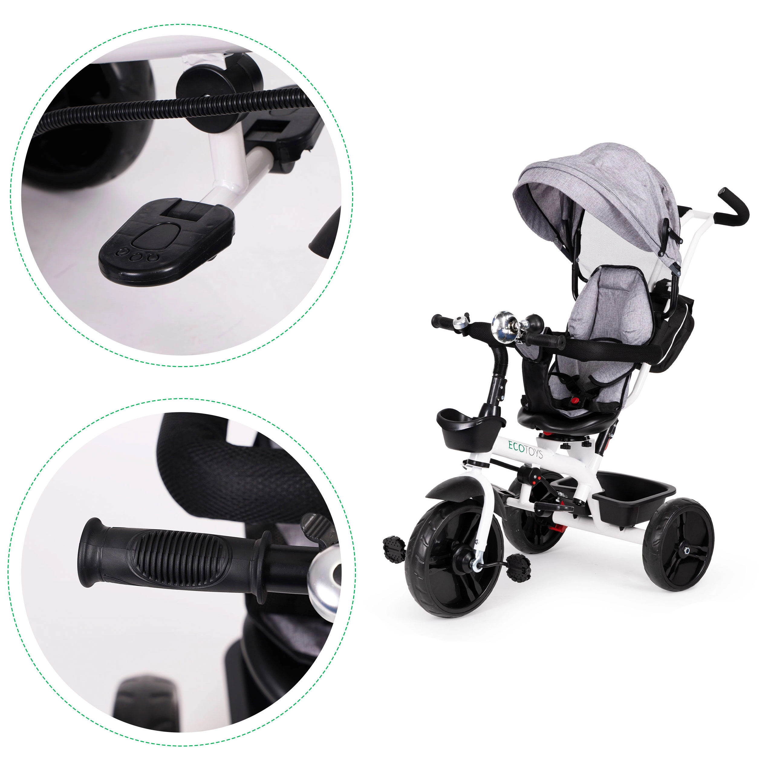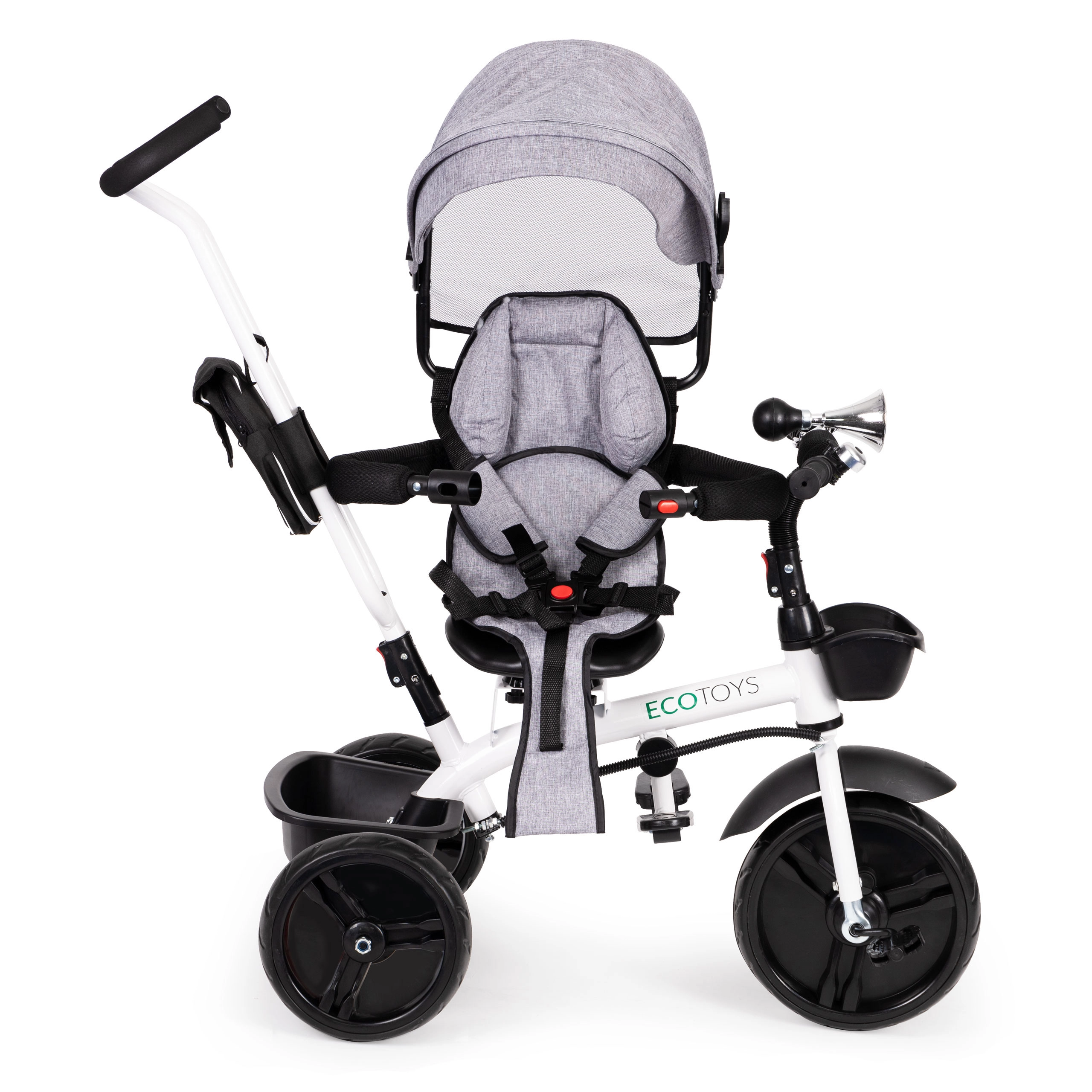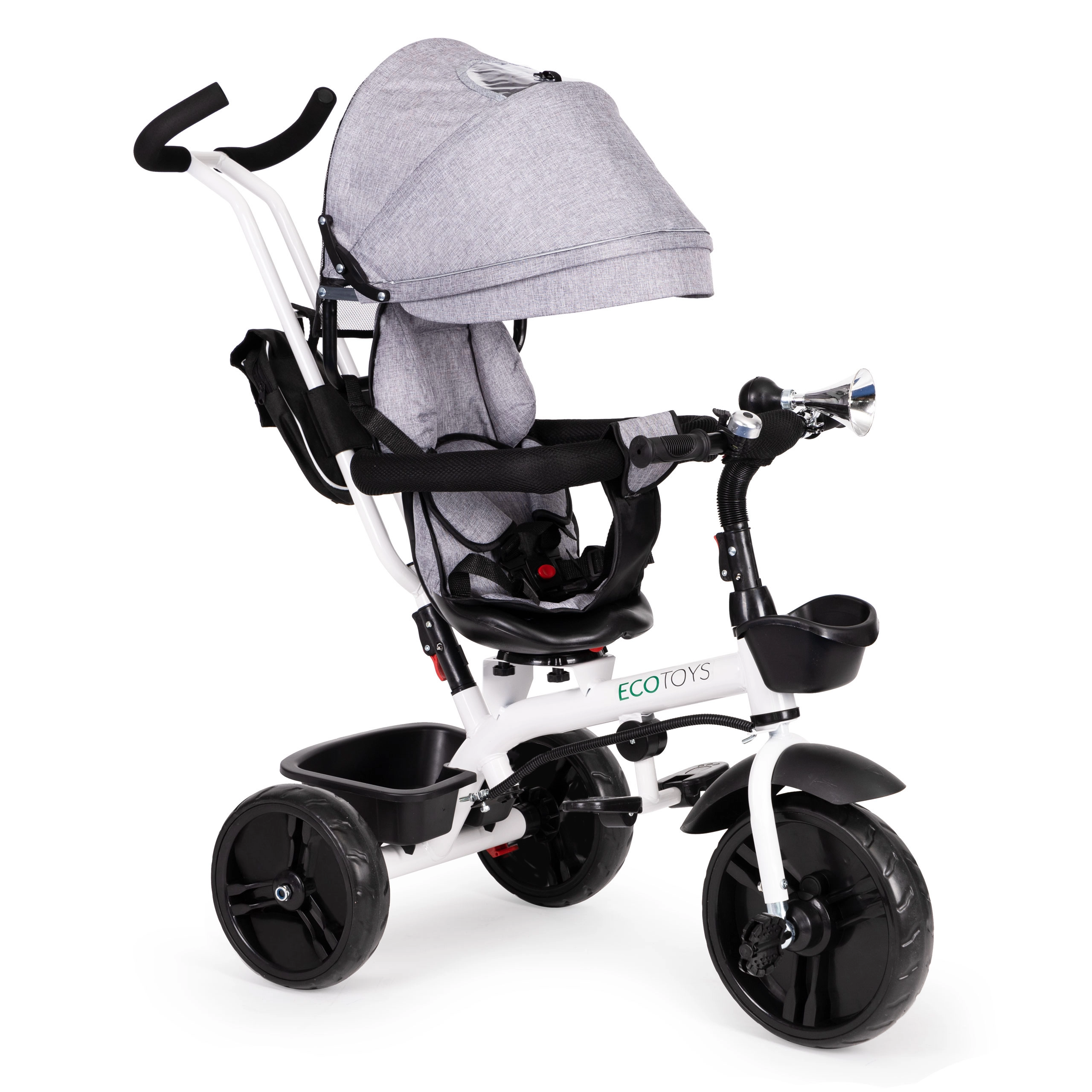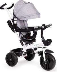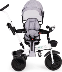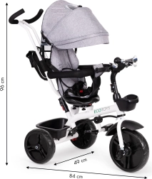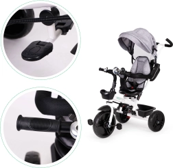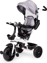 See multifunktsionaalne kolmerattaline kasvab koos lapsega: vanemajuhtimise režiimist kuni iseseisva sõiduni. 360° pööratav iste võimaldab seada asendi kas vanema poole parema kontakti nimel või sõidusuunas uudishimulikele avastajatele. Polsterdatud iste, viiepunktiline turvarihm ja kaitsepiire pakuvad kindlust, samas kui reguleeritav varikatus kaitseb päikese ja kerge vihma eest.
