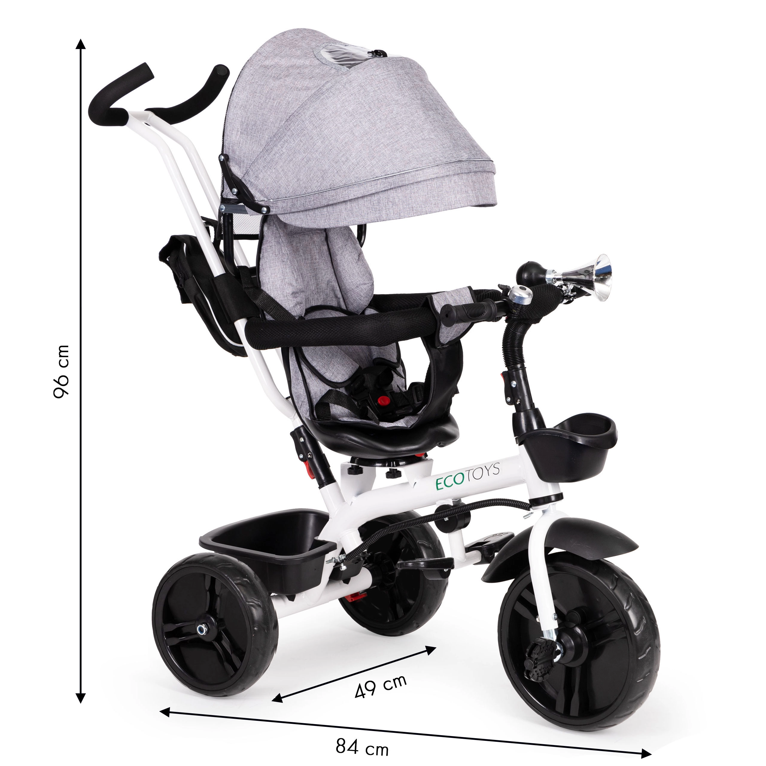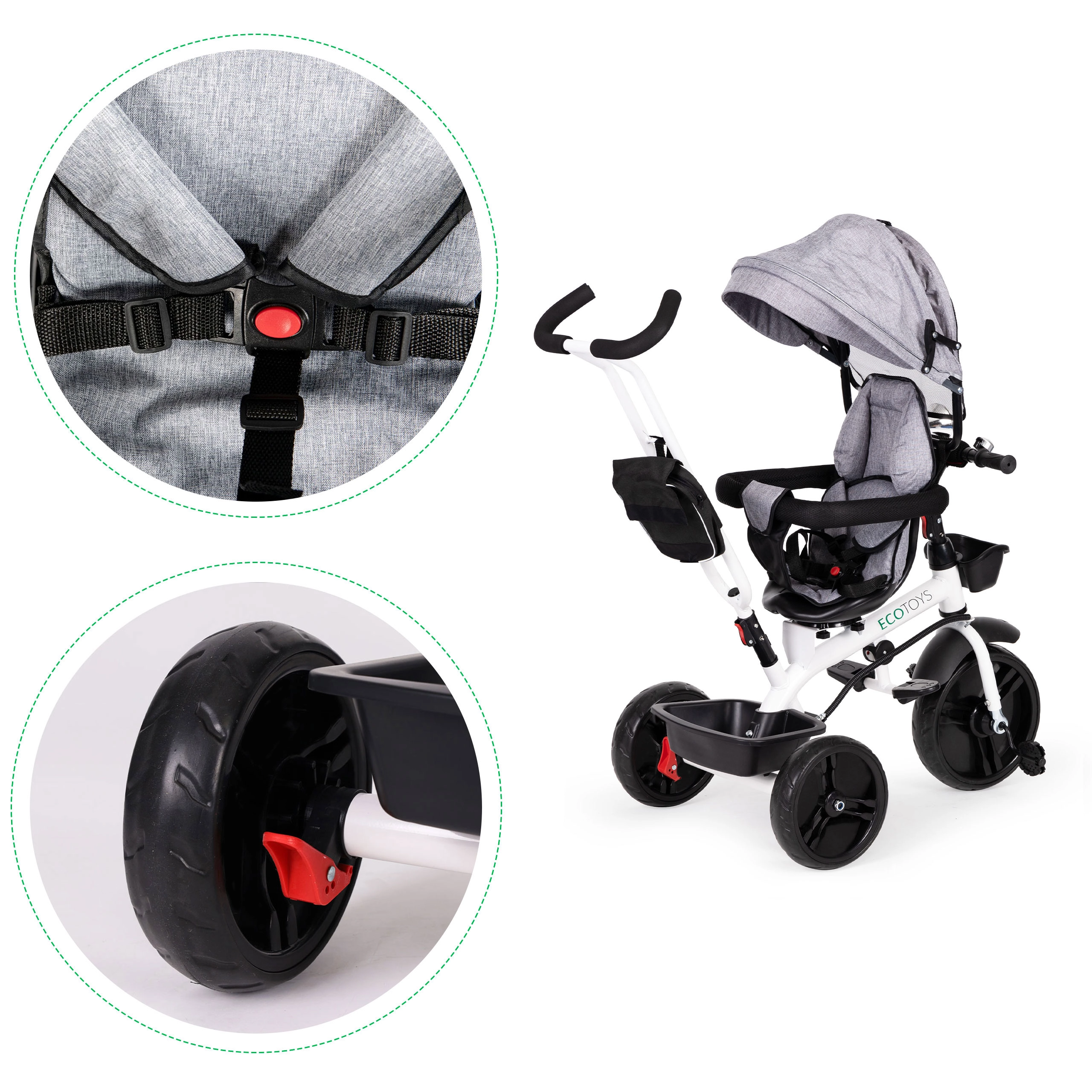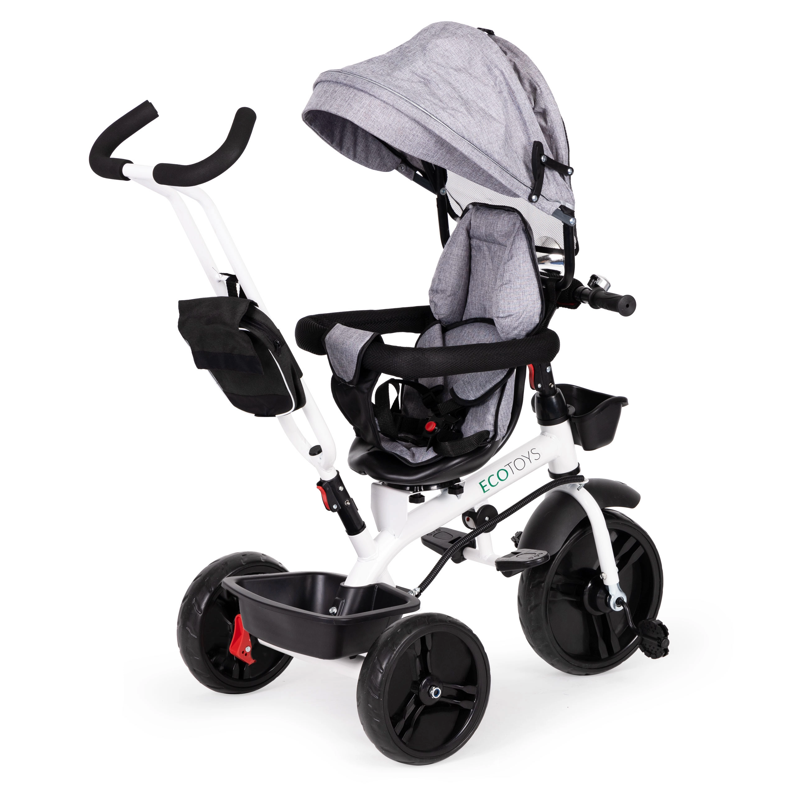 See multifunktsionaalne kolmerattaline kasvab koos lapsega: vanemajuhtimise režiimist kuni iseseisva sõiduni. 360° pööratav iste võimaldab seada asendi kas vanema poole parema kontakti nimel või sõidusuunas uudishimulikele avastajatele. Polsterdatud iste, viiepunktiline turvarihm ja kaitsepiire pakuvad kindlust, samas kui reguleeritav varikatus kaitseb päikese ja kerge vihma eest.