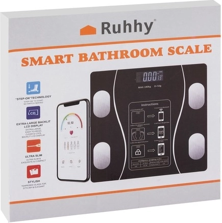 Hoia oma vormil silm peal RUHHY nutika kaaluga. Tänu neljale täpsele andurile ja Bluetooth-ühendusele saad telefoni põhjaliku kehaanalüüsi. Karastatud klaasist must klaasplatvorm sobitub iga vannitoaga ning pakub turvalist ja stabiilset mõõtmist kuni 180 kg.