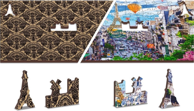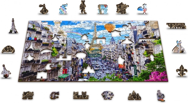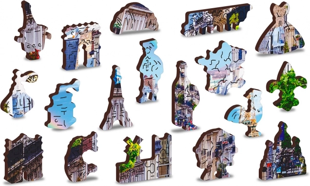 WOODEN CITY puidust pusle Sagin Pariisis on ainulaadne oma kahepoolse ülesehituse ja erikujuliste tükkide poolest, mis muudavad stseeni kokkupanemisel elavamaks. Kokkupanek on väljakutsuvam eri kujuga tükkide tõttu, kuid samas lõbusam. See pakub pinget ka kogenud puslesõpradele.