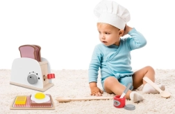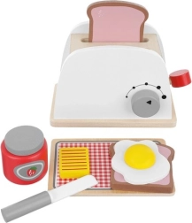 Täielik hommikusöögikomplekt väikestele kokkadele: puidust röster, 2 viilu röstsai, praemunana kujundatud muna, juust, puidust nuga, moosipurk ja serveerimiskandik. Lapsed saavad valmistada realistliku hommikusöögi, matkida täiskasvanuid ning avastada kujundeid ja värve. Looduslikud materjalid on vastupidavad ja ohutud igapäevaseks mänguks.