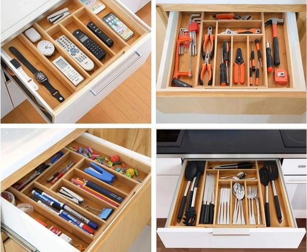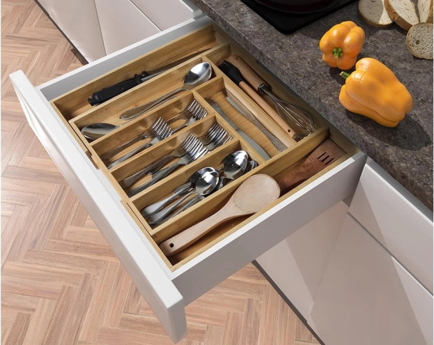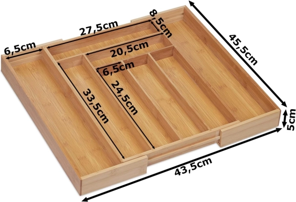Laiendatavad sektsioonid annavad paindlikkuse erineva laiusega sahtlite jaoks, muutes korraldaja universaalselt sobivaks igasse kööki. Selle kõrge töötluskvaliteet tagab pika kasutusea ja lisab igasse ruumi esteetikat.