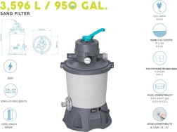 Tänu mahule 3596 l/h sobib pump basseinidele mahuga 1 100 kuni 18 100 liitrit. Töötamiseks vajab see liivtäidet (kvartsliiv #20, fraktsioon 0,45–0,85 mm, ligikaudu 8,5 kg) või suure jõudlusega Polysphere™ filtribeebisid umbes 240 g.
