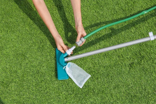 Komplekt sisaldab selliseid komponente nagu tolmuimeja ja võrk, mis eemaldavad basseinist mustuse tõhusalt.