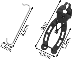 Praktilised tangid jalgrattaketi kiirühenduste avamiseks ja sulgemiseks, täiendatud ketikonksuga, et hoida ketti hoolduse ajal pingul. Tugev konstruktsioon, ergonoomiline käepide ja universaalne kasutus enamiku jalgrattakettide puhul tagavad kiire ja õrna hoolduse ilma komponentide kahjustamise riskita.