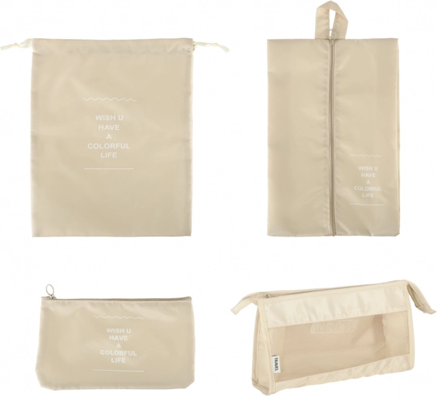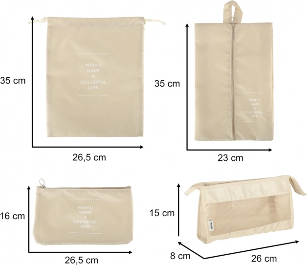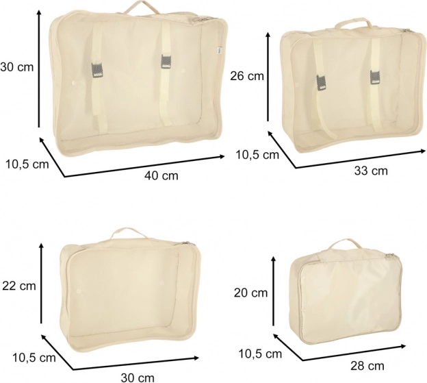 Saavuta oma pagasis kord jäädavalt. See 8-osaline elegantse beeži värviga reisikorraldajate komplekt sisaldab nelja riidekotti, jalanõukotti, kosmeetikakotti, nöörkinnisega kotti ja väikest taskut pisiesemetele. Kerge ja vastupidavast polüestrkangast valmistatud korraldajad on kergesti puhastatavad, mustuskindlad ja ideaalsed ülevaatlikuks pakkimiseks nii reisidel kui ka igapäevases kasutuses.
