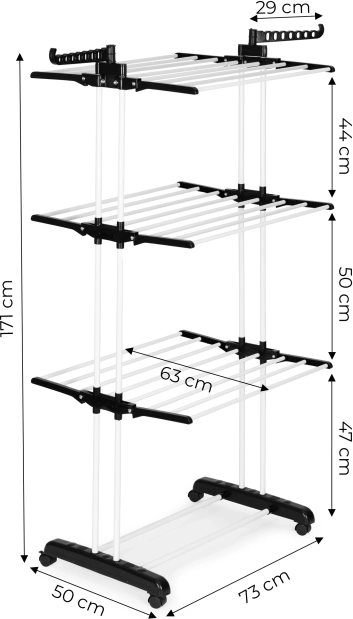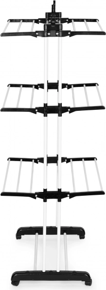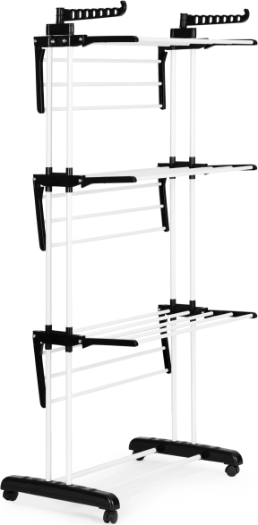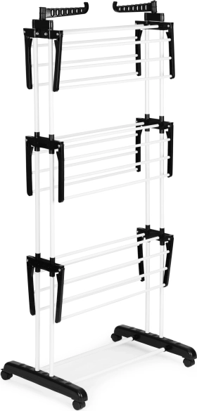 Vertikaalne kuivati sobib ideaalselt väiksematesse kodudesse, kus on vaja ruumi maksimaalselt ära kasutada. Mitmetasandiline paigutus pakub rohkelt ruumi T-särkidele, pükstele ja õrnadele esemetele, samas kui külgmisetel hoidikutel olevad avad on suurepärased särkide ja pluuside riputamiseks. Tänu lukustatavate ratastega alusele saad kuivati mugavalt viia sinna, kus parasjagu vaja kuivatada.