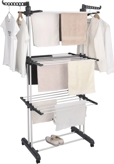 Kolm tasandit 6 kokkupandava haruga ja 2 riidepuuhoidjaga mahutavad suure koguse pesu, ilma et võtaksid toas palju ruumi.