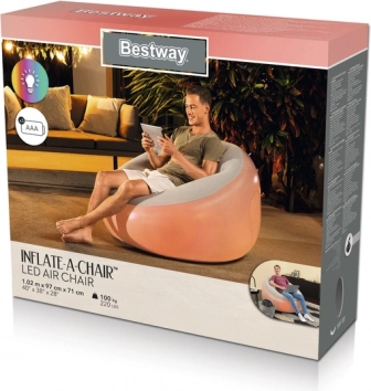 BESTWAY täispuhutav tugitool mõõtudega 102 × 97 × 71 cm on praktiline lahendus koju, ühiselamusse ja terrassile. Tänu integreeritud LED-taustvalgustusele (7 värvi) loob see meeldiva atmosfääri filmiõhtuks, mänguõhtuks või tööjärgseks puhkuseks. Tühjendatuna võtab minimaalselt ruumi ja on lihtne kaasas kanda.