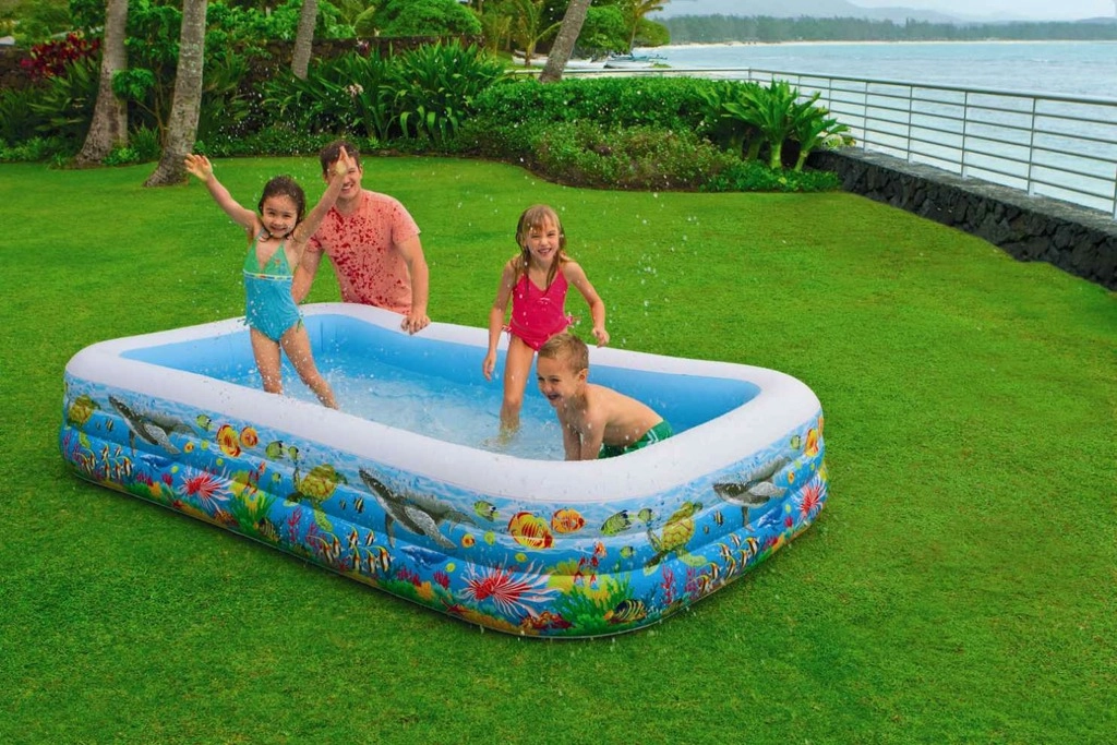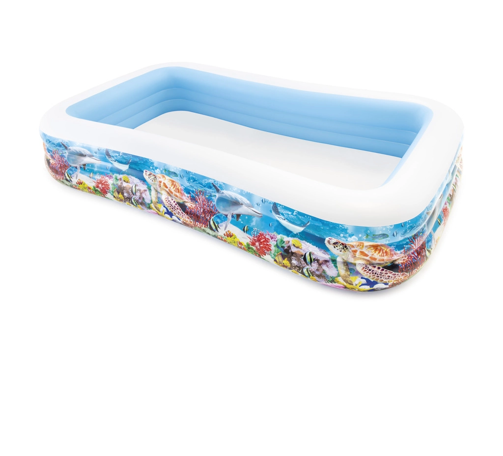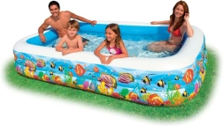 INTEX Tropical täispuhutav bassein meremaailma motiiviga muudab su aia värskendavaks oaasiks. Tänu suurtele mõõtudele 305 × 183 × 56 cm saavad selles mugavalt lustida nii lapsed alates 6. eluaastast kui ka täiskasvanud. Vastupidav vinüülmaterjal tagab pikaealisuse ja murevaba kasutuse.