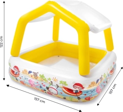 Mõõtmed 157 × 157 × 122 cm ja 280 l maht annavad rohkelt ruumi mängimiseks. Pehmed täispuhutavad seinad suurendavad turvalisust müramisel.