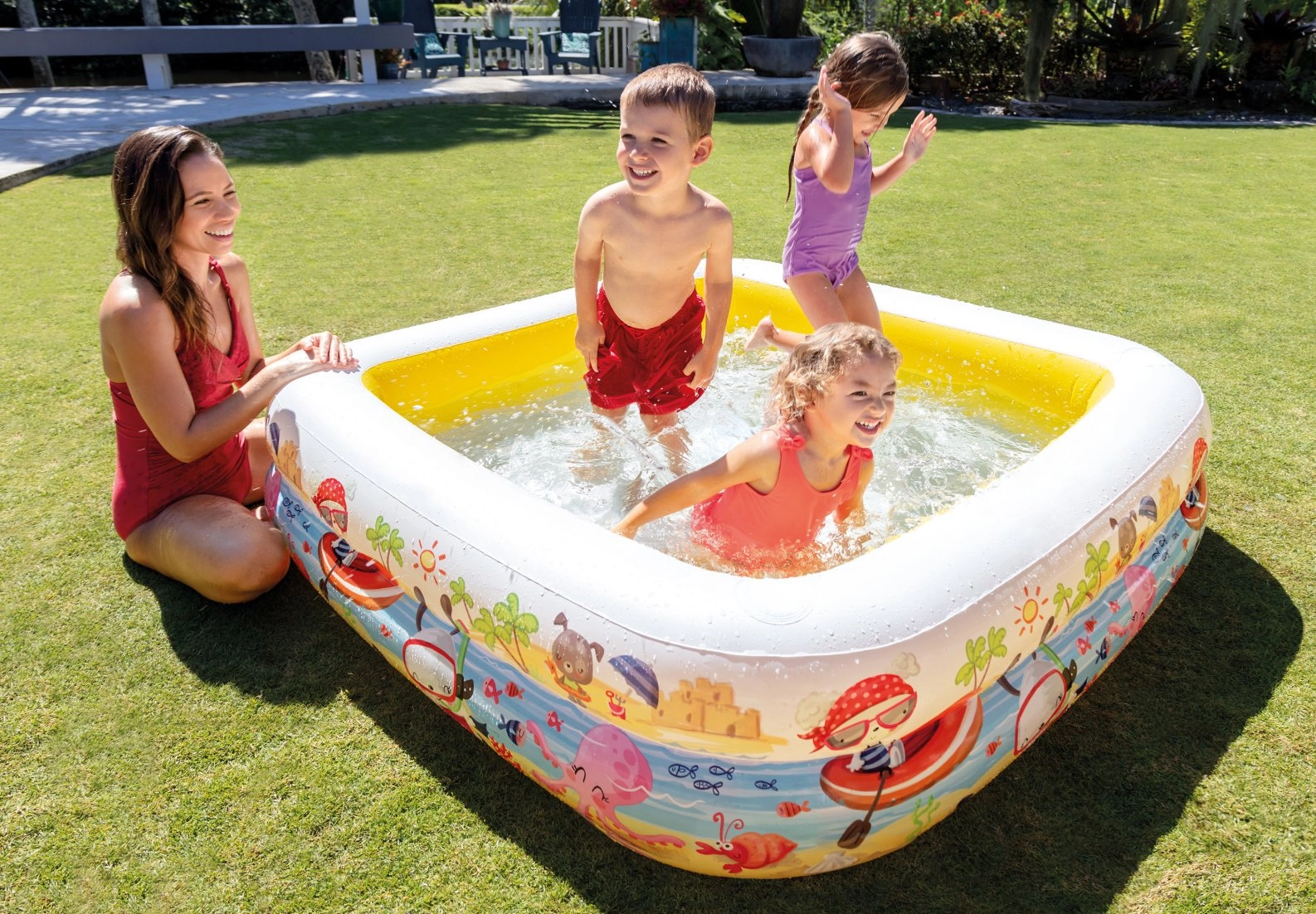 Komplektis on takjaga eemaldatav katus, mis pakub päikeseliste ilmadega mõnusat varju. Värvilised mereteemalised motiivid külgedel köidavad laste tähelepanu ja muudavad iga veemängu lõbusaks seikluseks. Tänu tühjendusventiilile on hooldus ja vee väljalaskmine kiire ja lihtne.