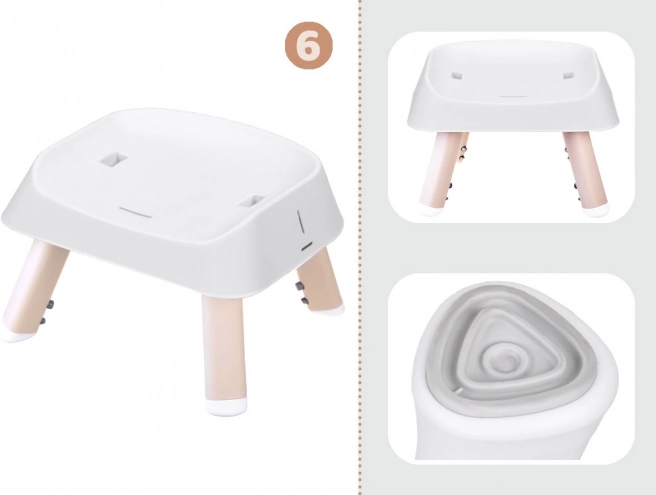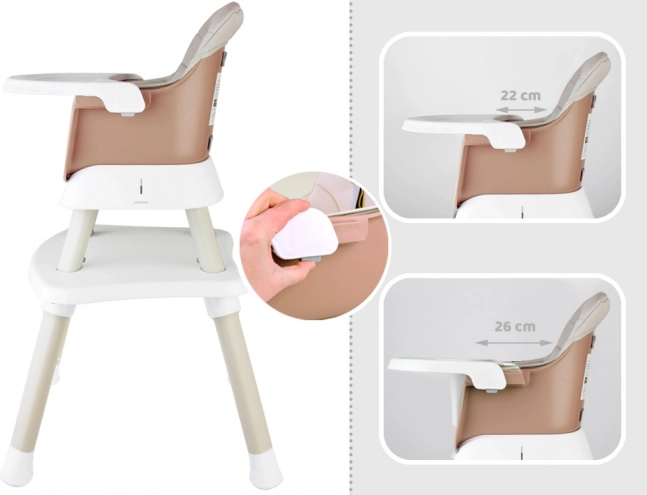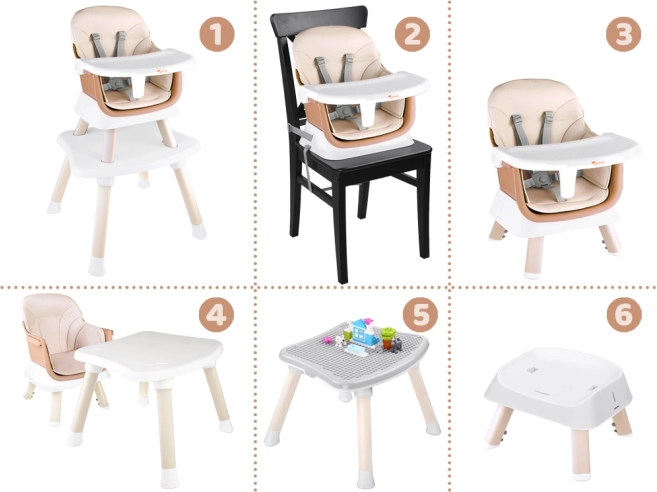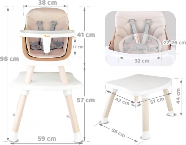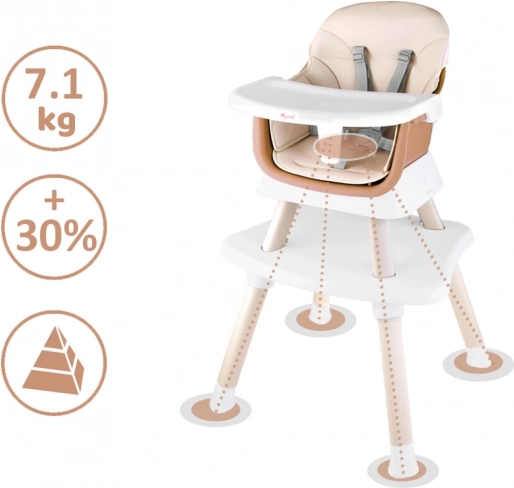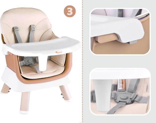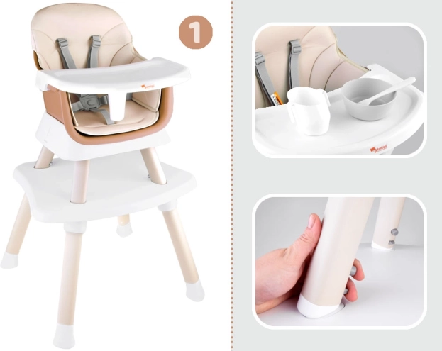 See mitmeotstarbeline 6-ühes tool on ideaalne nii esimesteks lisatoitudeks kui ka iseseisvaks einestamiseks. Pakub kõrget ja madalat istet, võimalust lükata tool laua äärde, eraldi mängulauda ning isegi spetsiaalset klotsiplaati. Kaasaegne disain sobib igasse interjööri ja lihtne hooldus säästab aega.