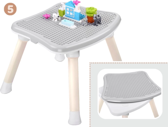 - 6 funktsiooni ühes: kõrge söögitool, toolilisand söögilaua juurde, madal tool kandikuga, tool lauaga, laud klotsiplaadiga, madal taburet