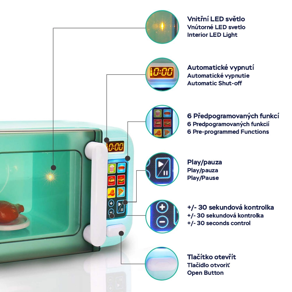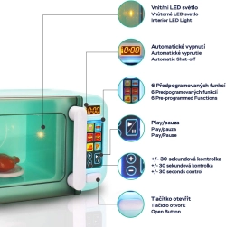 See stiilne laste mikrolaineahi on ideaalne täiendus igasse lastesöögituppa või mängukööki. Programmi sisselülitamisel hakkab taldrik sees pöörlema, ahi süttib ja teeb hääli nagu tõeline seade. Tänu puuteekraanile saavad lapsed hõlpsalt „valida“ programme ja omandada köögitegevuste põhitõdesid mängu kaudu.