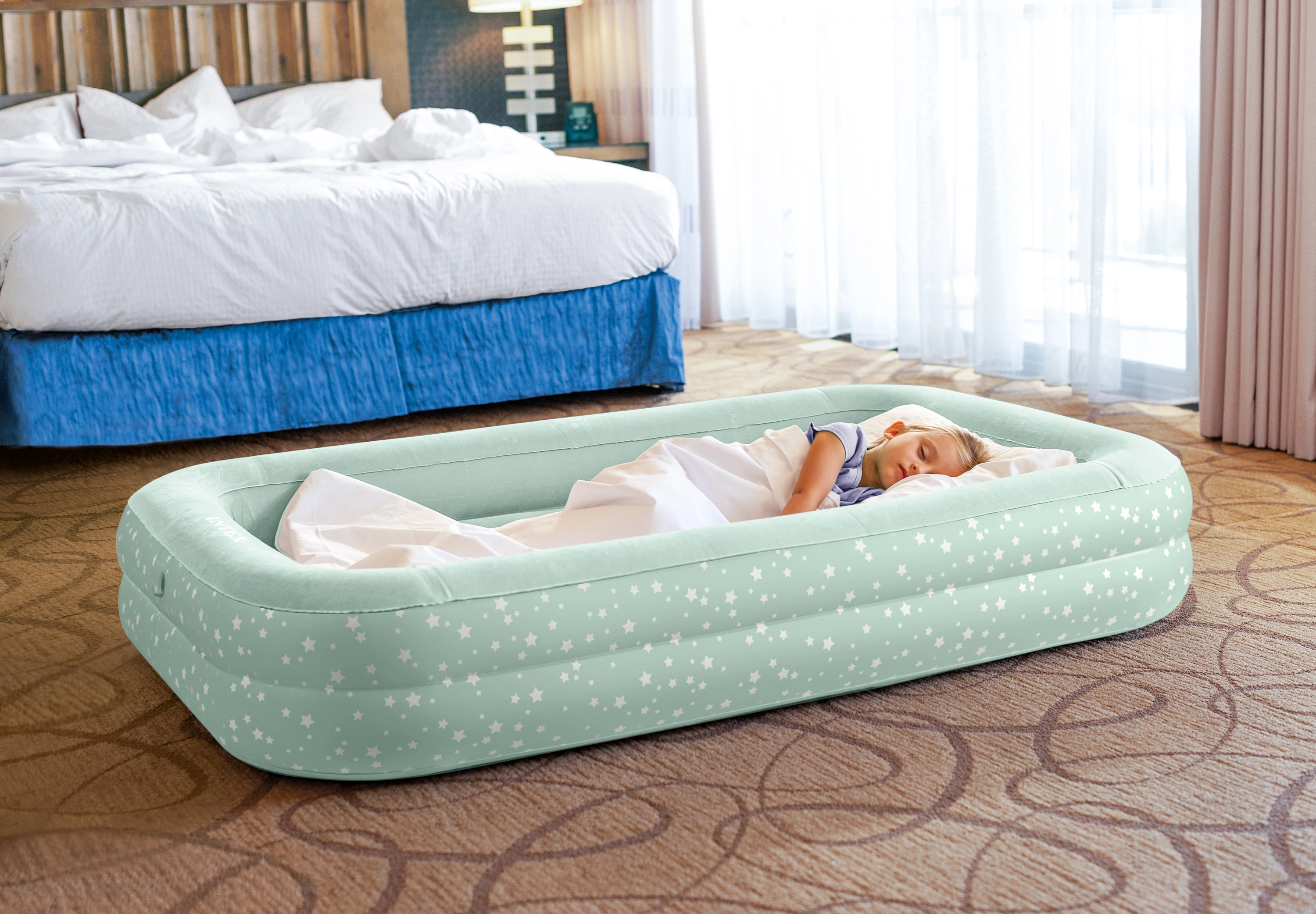 See täispuhutav madrats on mõeldud lastele ja sellel on kergelt tõstetud servad, mis aitavad vältida madratsilt maha veeremist. Ideaalne kasutamiseks siseruumides laste voodina.