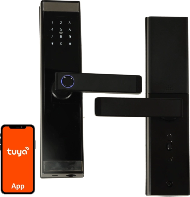 - Puutetundlik klaviatuur, sõrmejäljelugeja, RFID, mehaaniline võti, Tuya rakendus