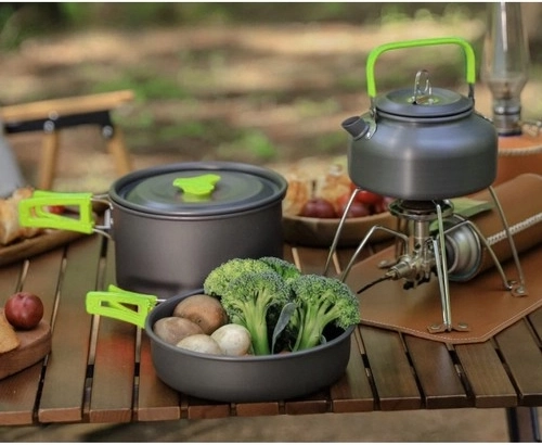 Kompaktne kämbernõude komplekt kahele inimesele koos mittekleepuva pinnaga ja kokkupandavate käepidemetega. Komplektis on pott, pann, teekann, kokkupandavad söögiriistad, kokkupandavad tassid ja praktiline transpordikott. Ideaalne telkimiseks, matkamiseks ja välitoidu valmistamiseks.
