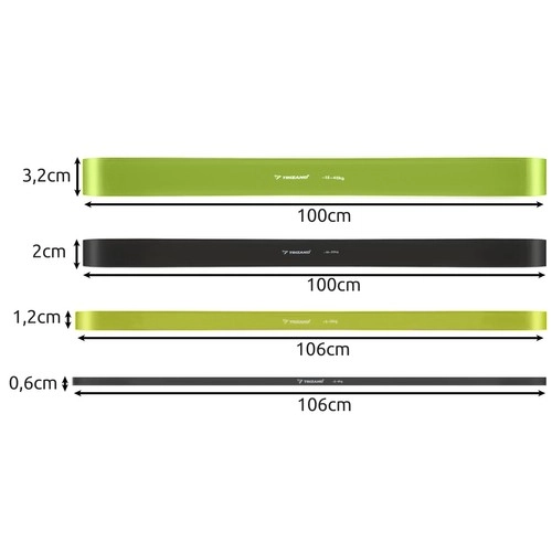 TRIZANDi täielik treeningkummide komplekt pakub 4 vastupanutaset jõutreeninguks, liikuvuseks ja taastusraviks. Valmistatud vastupidavast libisemiskindlast lateksist kõrge vastupidavusega, komplektis on ukseankur ja hoiukott, et treenida kõikjal. Tänu erinevatele laiustele ja vastupanudele kohandad intensiivsuse oma eesmärkidele – soojendusest kuni intensiivse jõutreeninguni.