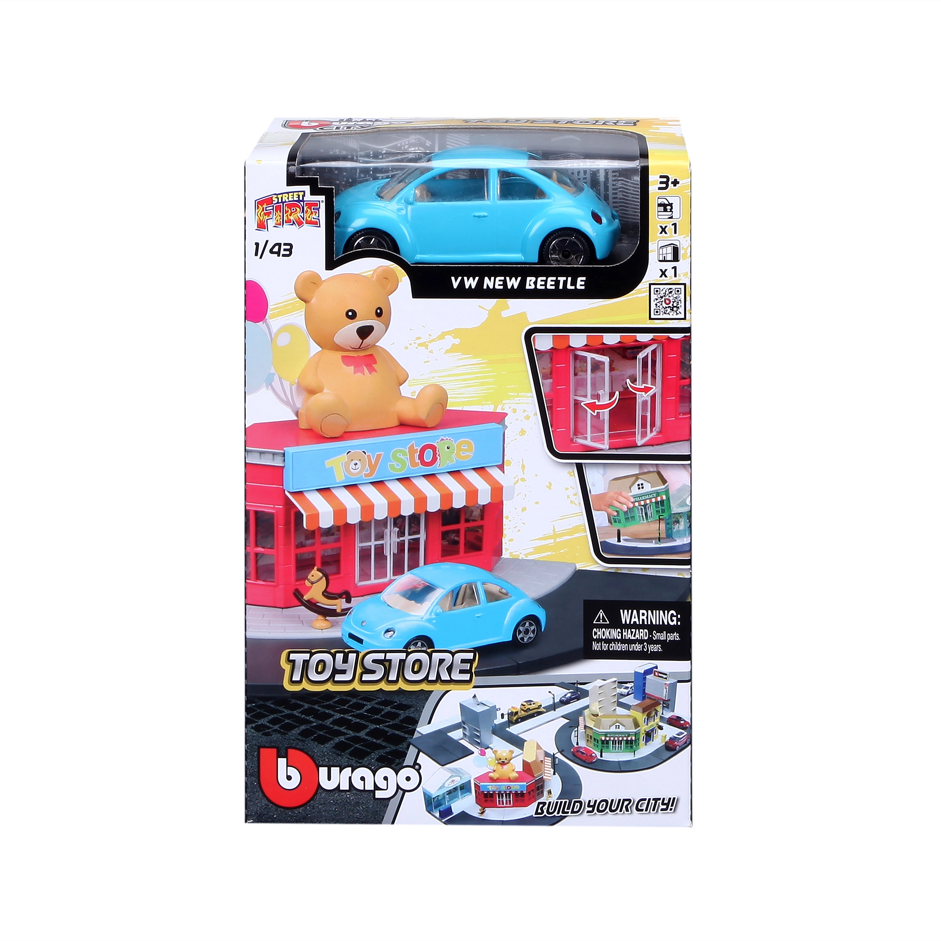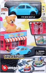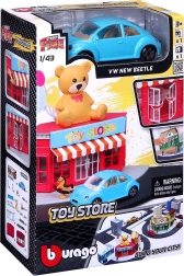 Ehita oma linn Bburago City Mänguasjapood 1:43 mängukomplektiga. Metallist automudel mõõtkavas 1:43, plastist hoone liikuvate ustega, tänava- ja kõnniteeelemendid ning erinevad lisad loominguliseks mänguks. Komplekti saab ühendada teiste StreetFire sarja setidega.