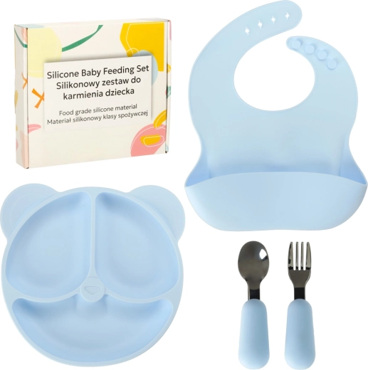 Praktiline 4-osaline silikoonist laste söögikomplekt sinises toonis armsa karumotiiviga tagab mugava ja ohutu einestamise. Sisaldab jaotustega taldrikut, taskuga põlle ja ergonoomilisi söögiriistu libisemisvastase viimistlusega. Valmistatud toidukvaliteediga silikoonist, kahjulike aineteta, lihtne puhastada ja soodustab iseseisvat söömist.