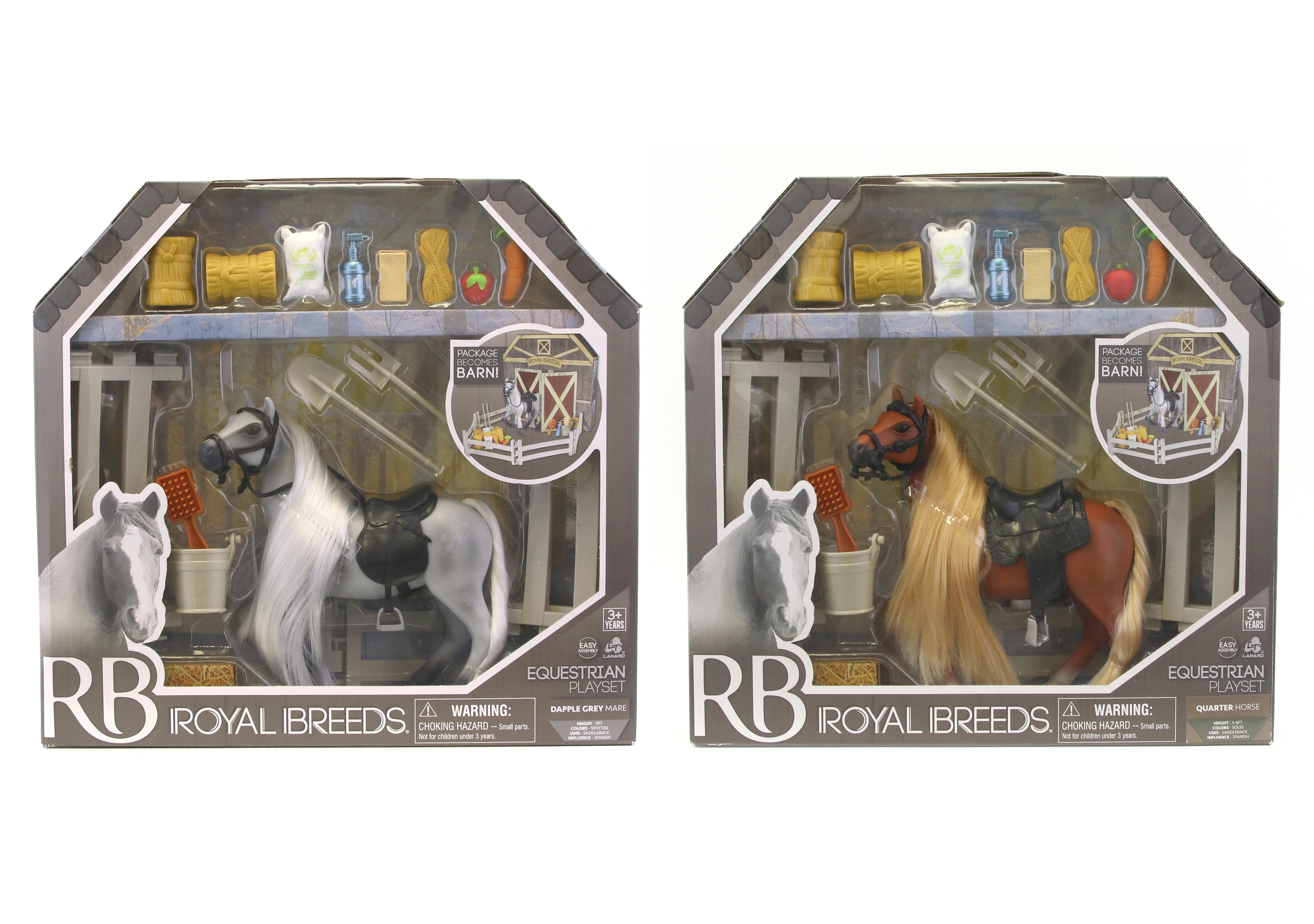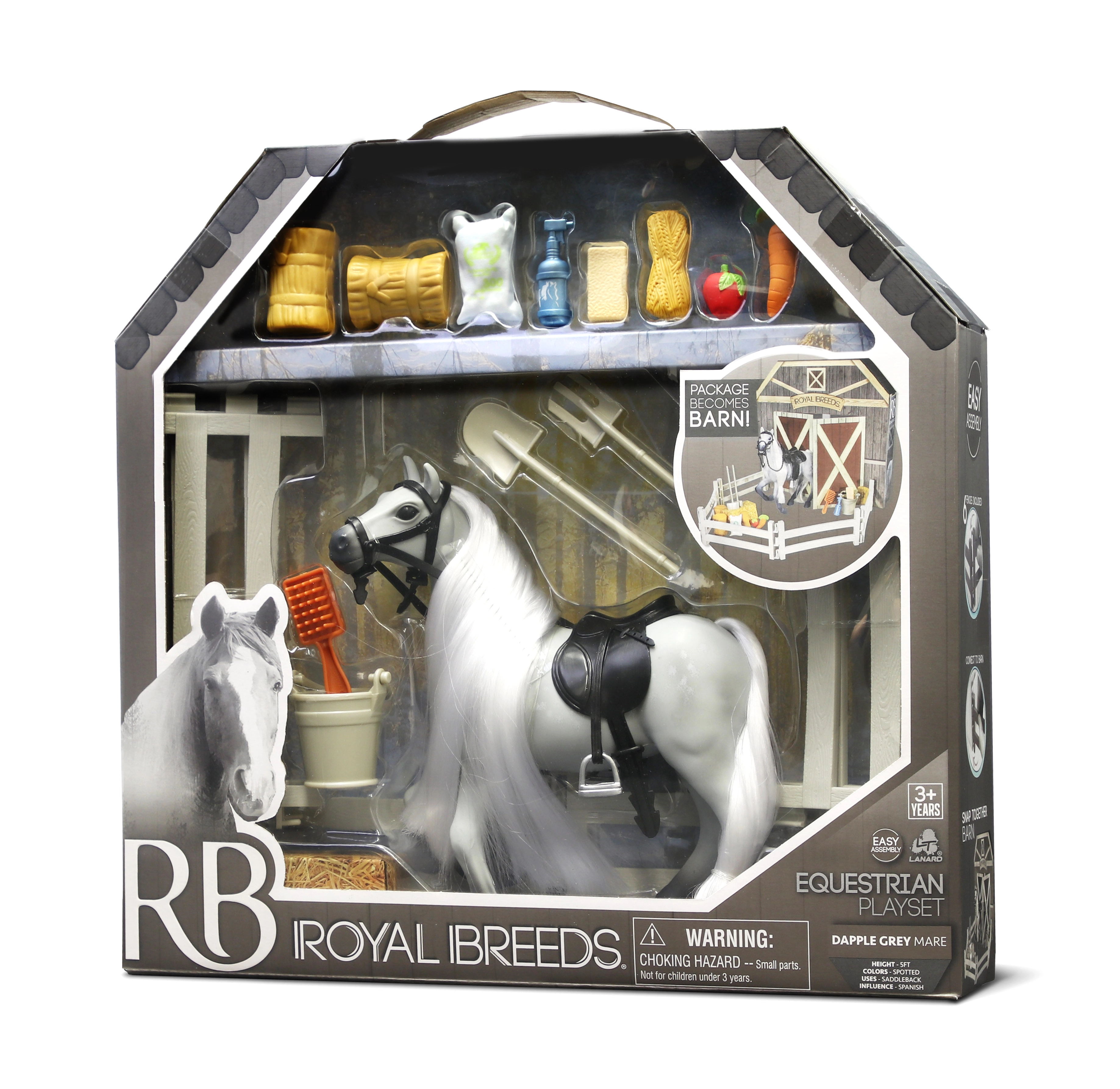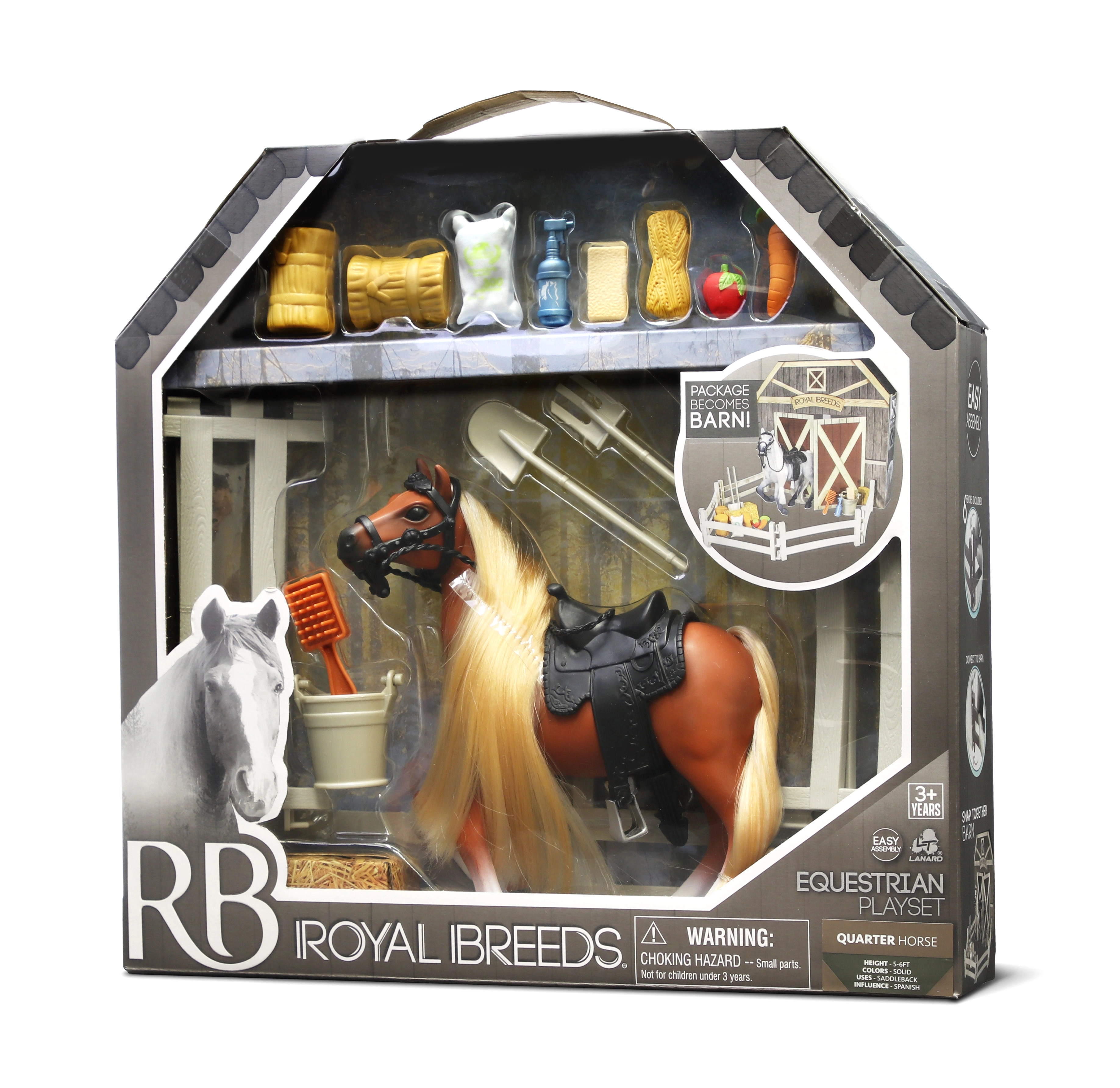 See komplekt sisaldab Royal Breeds hobust suurusega 17 cm ning interaktiivseid elemente, mis köidavad iga last. Pakendi avamisega tagumine külg laiendab mänguvõimalusi ja muutub talliks: