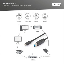 See kvaliteetne USB 3.0 kaabel USB‑C (isane) – USB‑B (isane) on mõeldud hostseadmete (arvuti, sülearvuti, USB‑jaotur) ühendamiseks USB‑B pordiga välisseadmetega, näiteks väliste kõvakettakarpide, skannerite või printeritega. USB 3.0 standard võimaldab SuperSpeed edastuskiirust kuni 5 Gbit/s, mis on kuni 10× kiirem kui USB 2.0, tagades kiire varundamise ja sujuva töö suurte failidega.