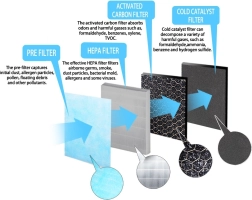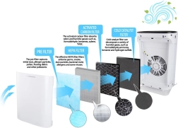 Püüab kuni 99,97% allergeene, õietolmu ja tolmu tänu 4-astmelisele filtrile: eelfilter, aktiivsöefilter, HEPA H11 filter ja külmkatalüütiline filter.